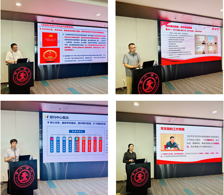 科研院党支部书记、常务副院长邵金友领学中共中央、国务院印发的《党政机关厉行节约反对浪费条例》内容,并汇报了学校近期科技创新取得成效以及推进基础研究、产教融合、成果转化等多项举措落实情况,服务学校高质量发展。实验室处党支部书记陈哲围绕支部组织建设与实验室安全工作情况进行汇报,强调以支部建设筑牢根基,踔厉昂扬齐心奋进。期刊中心党支部书记、主任张丛汇报了中心各部门建设与着力提升期刊质量的相关举措及成效,坚持以服务、队伍、文化、资源为一流期刊建设奠定良好基础。大仪实验中心党支部书记、主任高禄梅围绕支部常态化学习情况与校级平台开放运行当前成效进行了汇报,推动党建和业务深度融合,为学校教学科研提供了强有力的技术支撑。